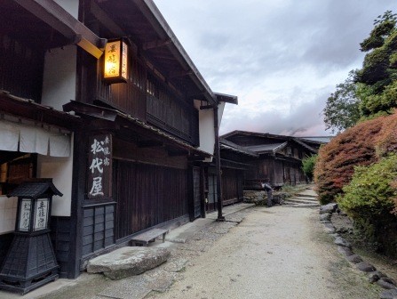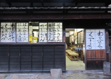 古い街並みが続く妻籠宿、いろいろなお店が並んでいましたが、周りは薄暗くなりつつあったので、大急ぎで駐車場に向かいました。(17時7分着)