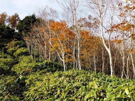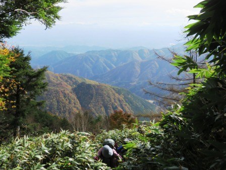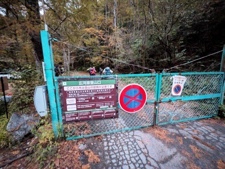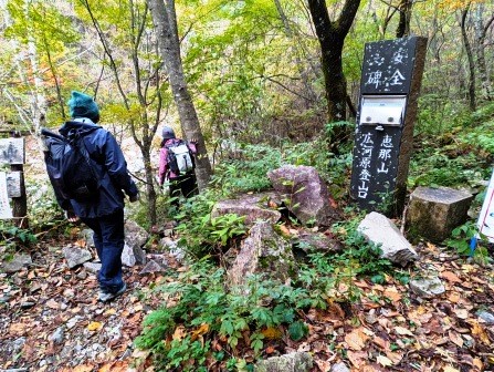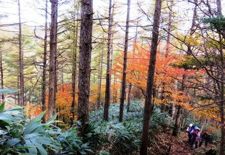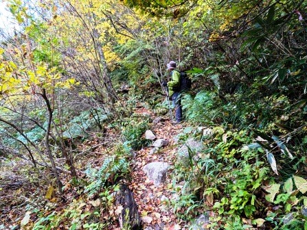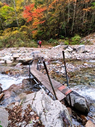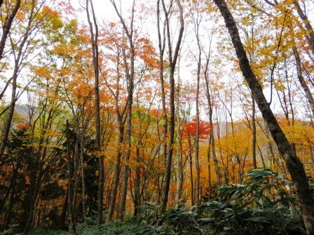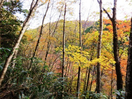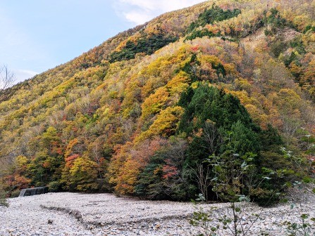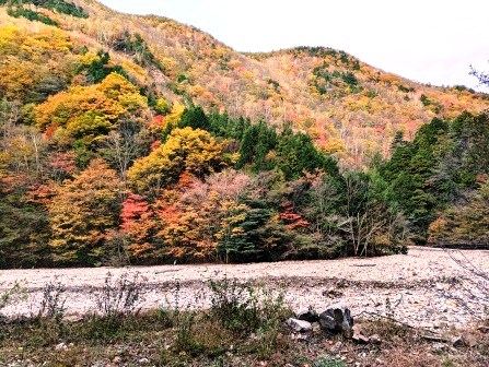 ここからは、川沿いに林道を歩いていきます。周りの山々は、紅葉していて、とても美しかったです。