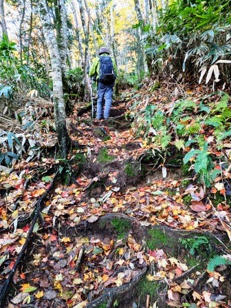 紅葉の美しさに癒されながら、色とりどりの落ち葉を踏みしめて登っていきます。